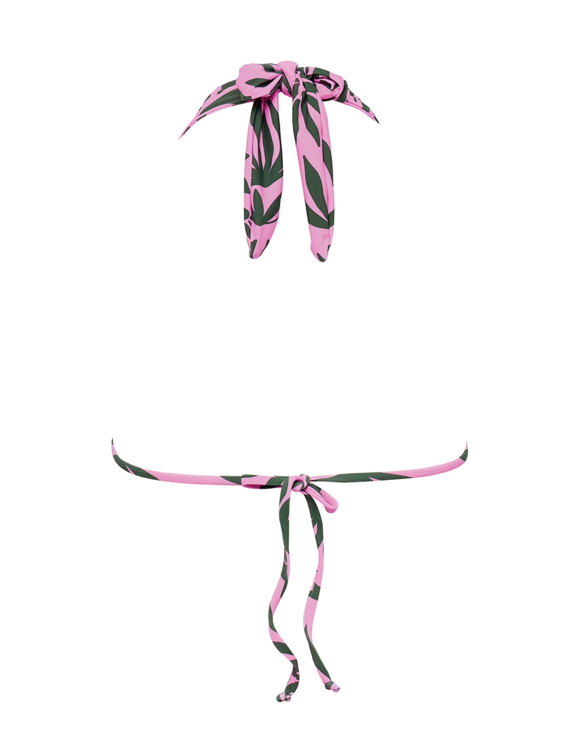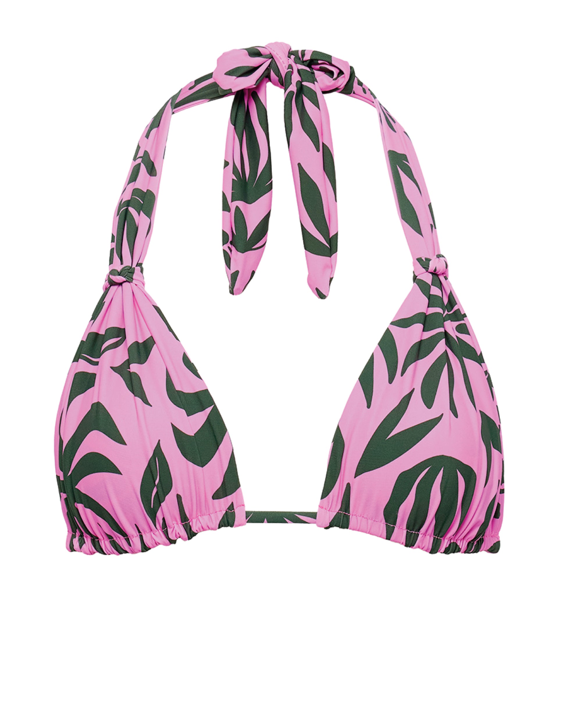 VYB Swim's Jemma Knotted Halter Bikini Top is designed for adjusting coverage on the go. This bra features adjustable loops around neck that can be pulled up for fuller coverage or dropped down for minimal tan lines. The clean finished Jemma top has ties around the neck and back. It is featured in a super soft pink print fabric from the Shady Palms collection.