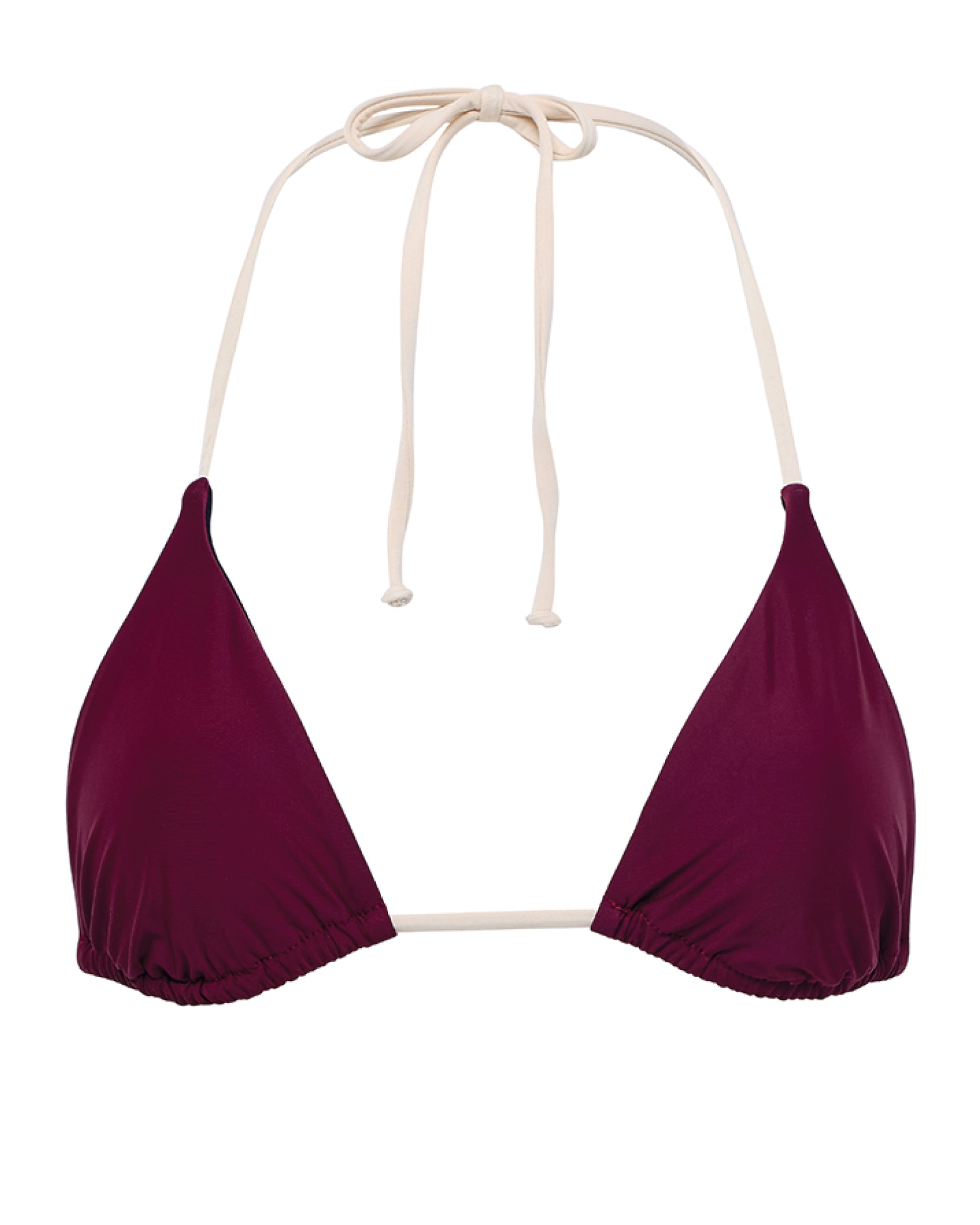A classic staple of the Blocked collection, the Jolie Triangle Bikini Top features a french cut triangle design with adjustable tunnels for customizing fit. It ties around the neck and back. This basic VYB Swim bra is featured in our colorblock solid Bordeaux and Natural Sand.