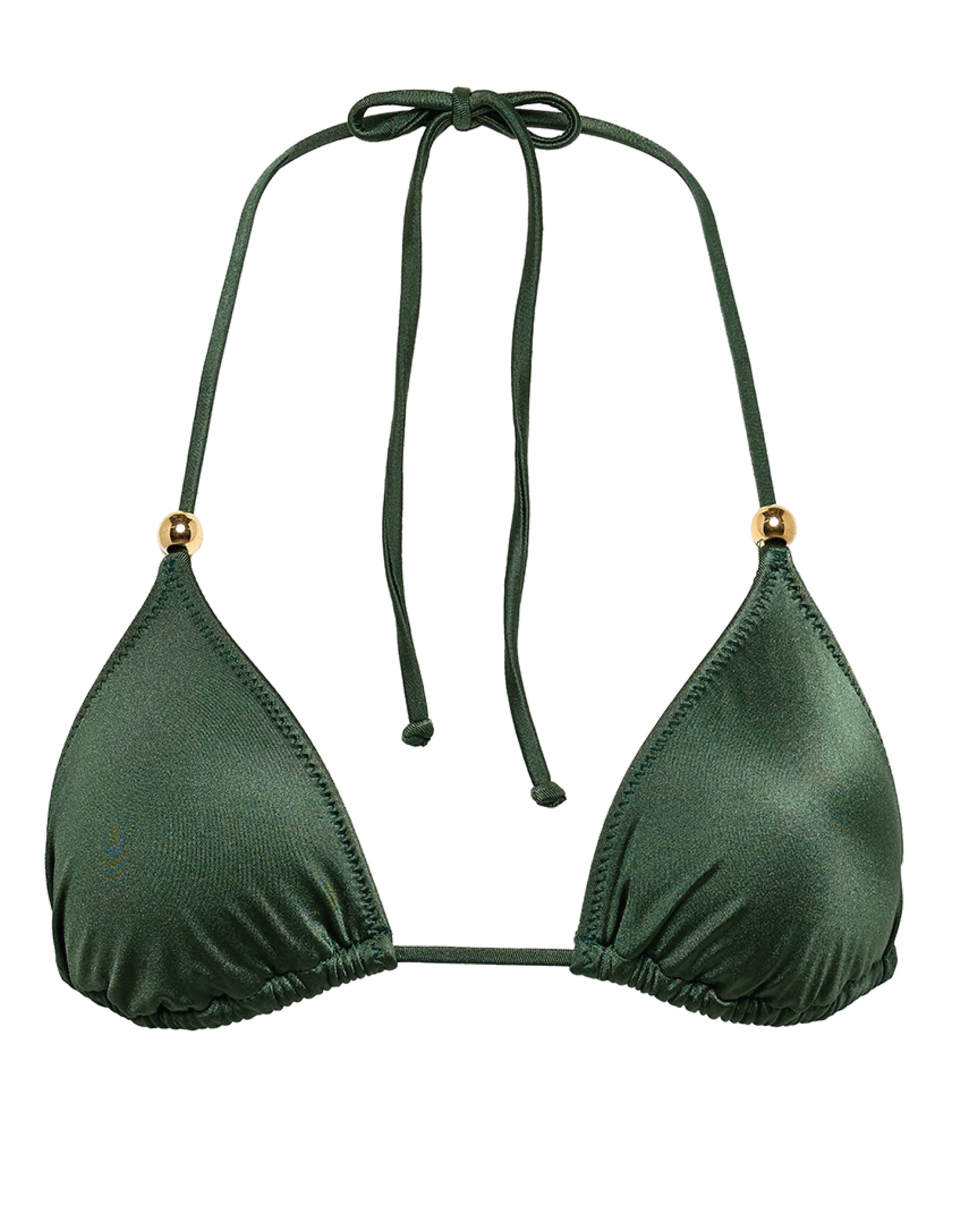 A classic staple of VYB Swim, the Ren Triangle Bikini Top features a french cut triangle design with adjustable tunnels for customizing fit. It ties around the neck and back. This basic VYB Swim bra features shiny gold beads along the neckline. This Ren bra has a zig zag top stitch and is featured in shine Seaweed fabric in the Butter Up collection.